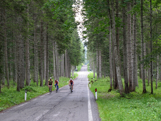 Val Pesarina. Es ist trotz einiger Geraden mindestens im oberen Teil schön zu fahren. Gemütlicher Wald mit vielen hohen Bäumen wartet auf die Reisenden.