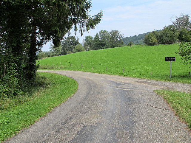 Die Passhöhe ist nicht mehr als eine Kreuzung mit Schild an der Seite. Die Abzweigung rechts führt nur auf einen Parkplatz, der mehr als Holzlager und Abstellkammer Verwendung findet. Links geht es nach Norden ins Tal.