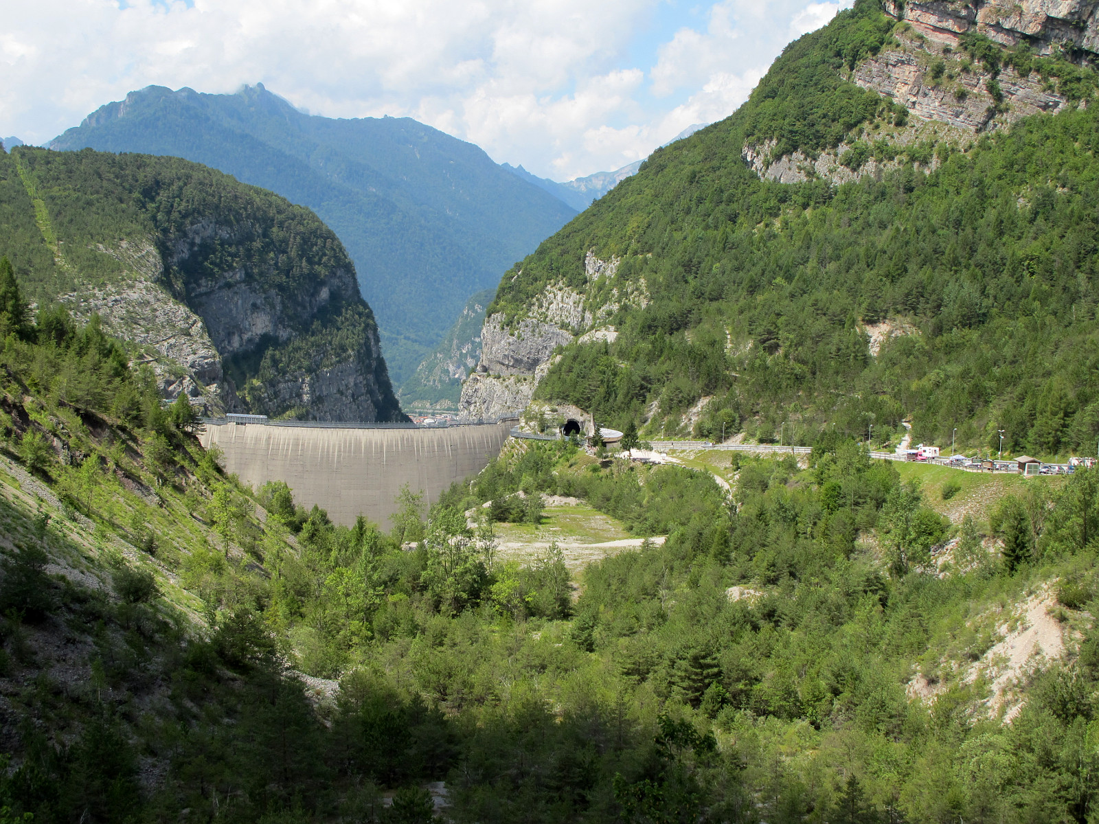 Links der Bildmitte ist die nahezu unbeschädigte Vajont-Staumauer zu sehen, rechts daneben der Tunnelausgang, noch weiter rechts ein Parkplatz mit diversen Informationen über die Szenerie. Die ansteigende Bergflanke links im Bild ist Teil des abgerutschten Materials.